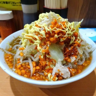 らーめん忍者(秋葉原) にぼ二郎1,000円 (野菜マシ、アブラ、辛揚げ、カレーマヨ) 「らーめんだけど主役はお肉」という、 秋葉原の『らーめん忍者』。 日曜日の開店時間11時で、開店待ちは5人。 カウンター10席ほどの薄暗い店内は、清潔な雰囲気。 前回の利用以降に、値上げしました。 メニューは、らーめん980円 デカ豚らーめん1,180円 豚マシらーめん1,250円 特製らーめん1,150円など。 ■無料トッピングは、7種類から選べます! (野菜、ニンニク、アブラ、 カラメ、辛揚げ、カレーマヨ、黒マー油) ■紙エプロンは、給水機の上にあります。 今回も、にぼ二郎1,000円の食券を購入。 食券を渡す際に、無料トッピングをオーダーします。 「野菜マシ、アブラ、辛揚げ、カレーマヨ」 をお願いします! そして、10分ほど待つと出来上がり。 お待たせしました~!・・・ドスン!!! どひゃ~~~、す・すごいボリューム!!! 直径22センチの丼に盛り付けられた、 デカ盛り煮干しラーメン! 山盛り野菜に、ぶ厚い豚2枚をのせ、 さらに、辛揚げ、カレーマヨをトッピングして、 ものすごい迫力! 丼を持ち上げると、重さは1キロくらいありそう! ボリューム満点の煮干しラーメンです! さっそく野菜の山頂から攻撃を開始! おぉぉぉ~~~、こりゃ~たまらん!!! 辛揚げとカレーマヨをかけた野菜を サラダ感覚で食べちゃいます! 野菜を一気に片付けると、 スープと麺が姿を現します! 背脂が浮いたスープは、 煮干しのダシを効かせたマイルドな味わい! 天地返しで麺を裏返し、豚をスープに沈めます! 太麺はコシが強く、ザクッとした食感! 厚さ1.5センチほどの豚は、スープで温めると、 しっとり柔らかくなります! 特に脂身の部分は、口の中でとろけて、 たまらなく美味しい! 味わいながら一気に完食して、満腹度は110% 野菜と肉をタップリ補給できて、 とてもヘルシーで美味しい煮干しラーメンでした! 「にぼ二郎」が1,000円ですから、 素晴らしいコスパだと思います! 土・日・祝日も営業していて、使い勝手は良好! お店の周辺に、有料Pがあります。 店名 らーめん忍者 住所 東京都千代田区神田松永町17-3 秋葉原妙見屋ビル1F 電話 03-5207-2779 定休 無休 営業 月~土11:00-22:45 日・祝11:00-21:30 総 合:★★★★ 4pt 料 理:★★★★ 4pt サービス:★★★★★ 5pt 雰 囲 気:★★★★ 4pt コ ス パ:★★★★ 4pt お店情報 らーめん 忍者 - 秋葉原/ラーメン | 食べログ (tabelog.com) ←←食べたくなった方は、ポチッとね!にほんブログ村 ←←皆様のポチッ!が励みになります!大盛り・デカ盛りランキング らーめん 忍者 関連ランキング:ラーメン | 秋葉原駅、末広町駅、岩本町駅