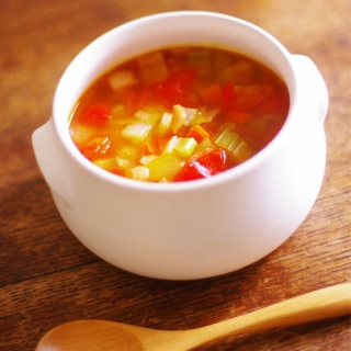 (2人分)ミニトマト 15個前後ベーコン (ハーフサイズ) 4枚セロリ 1/2本玉ねぎ 1/2個にんじん 1/2本顆粒コンソメ 小さじ2塩 少々水 400cc1.ミニトマトは4等分に切る。ベーコンは2~3mm幅の四方形に切る。セロリ、玉ねぎ、にんじんは2~3mm角に切る。2.ミニトマト、ベーコン、セロリ、玉ねぎを、電子レンジ対応の耐熱容器に入れる。ラップをして600Wの電子レンジで約7分加熱調理する。3.にんじんが柔らかくなり、加熱調理を終えたら、水を入れて電子レンジで沸騰するまでラップをしないで約8分加熱調理する。再度加熱調理を終えたら、コンソメを溶かし入れ、塩で味を整えて仕上げる。※塩の量はお好みで加減してください。※にんじんが固いと感じる場合は工程3での水を入れてからの加熱時間を長めにして、加減調整して下さい。