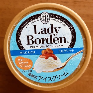 レディーボーデン ミルクリッチ 以前買っていたボーデン新作を解き放つ。 覚悟はしていたが、かなり甘い!!それも甘いけど美味しい!という感じでなく、私の苦手なべたつく甘さ。バタースカッチソースより、ミルクアイス部分の方が甘い。これ本当にミルクアイス?ミルク感ゼロなんだが…。やっぱアイスクリーム規格苦手かも…。