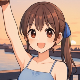 夕暮れの港を背景に、青いワンピースを着た可愛い女の子が笑顔でビール瓶を掲げるアニメ風イラストです。大きな瞳に夕日が映り込み、開放感と幸せな瞬間が伝わってきます。夏の思い出や、日常の小さな喜びを表現した一枚です。An anime-style illustration of a cute girl in a light blue dress, smiling and raising a beer bottle against a sunset harbor backdrop. Her large eyes reflect the warm evening light, capturing a joyful and carefree summer moment. Perfect for themes of happiness, relaxation, and scenic beauty.