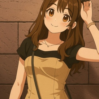 石壁の前でポーズをとる、リボン付きカチューシャが可愛い女の子のアニメ風イラストです。ベージュのワンピースと黒のトップス、ぬいぐるみ付きバッグがチャームポイント。日常の中のちょっとしたおしゃれと笑顔を描いた一枚です。An anime-style illustration of a cute girl posing in front of a stone wall, wearing a ribbon headband, beige dress, and black top. Her bag features plush keychains, adding charm to her casual fashion. A cheerful scene capturing everyday style and personality.