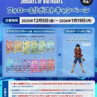ONE PIECE BASE SHOP くじ 366DAYS OF BIRTHDAYS フォロー&リポストキャンペーン【フルカラーフィギュアなどが抽選で2名に当たる】