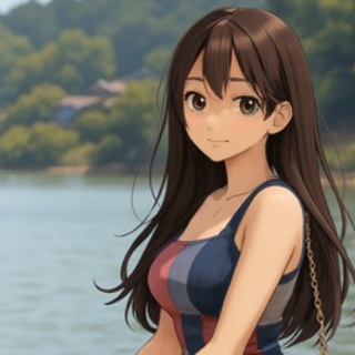 湖畔の木製の手すりに腰かける美少女を描いたアニメ風イラスト。幾何学模様のワンピースと柔らかな表情が、自然の中で過ごす穏やかなひとときを優しく表現しています。 An anime-style illustration of a cute girl sitting on a wooden railing by a calm lake. Her geometric-patterned dress and gentle smile reflect a peaceful moment in nature.