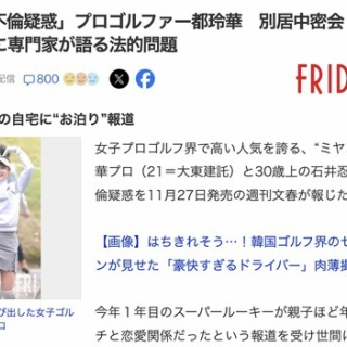 1 : 「30歳差不倫疑惑」プロゴルファー都玲華 別居中密会・路上“股間タッチ”に専門家が語る法的問題(FRIDAY) - Yahoo!ニュース 女子プロゴルフ界で高い人気を誇る、“ミヤコレ”こと都玲華プロ(21=大東建託)と30歳上の石井忍コーチとの不倫疑惑を11月27日発売の週刊文春が報じた。 今年1年目のスーパールーキーが親子ほど年の離れたコーチと恋愛関係だったという報道を受け世間に衝撃を与えている。 「都プロは、頻繁に石井コーチの自宅に泊まっていたといいます。中でも都プロが石井コーチと歩いている際に、彼の股間に何度も手を伸ばしていたようで、下半身をタッチしている写真が掲載されていたことに非常に驚きました。その後、石井コーチも彼女の胸に手を伸ばして触れていたようです。人気プロとその現役のコーチなのに路上でそんなことをするなんて大胆すぎますね」(女性誌記者)全文はソースで 2 : ムホホ 3 : 天然の魔性属性の女ってたまにおるからねそのタイプなんやろね