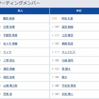 転載元: https://tanuki.5ch.net/test/read.cgi/livebase/1759452133/https://sp.baseball.findfriends.jp/?pid=game_flash_info&game_id=2025100404 900: どうですか解説の名無しさん 2025/10/04(土) 12:20:05.43 ID:7YGYeqIB 巨人スタメン▼ 先発 #園田純規 1(遊)#石塚裕惺 2(三)#宇都宮葵星 3(中)#佐々木俊輔 4(指)#ティマ 5(左)#三塚琉生 6(二)#浦田俊輔 7(右)#岡田悠希 8(捕)#山瀬慎之助 9(一)#荒巻悠 907: どうですか解説の名無しさん 2025/10/04(土) 12:22:35.27 ID:xDW/+8ER >>900 浅野の名前がないのが少し寂しいわ