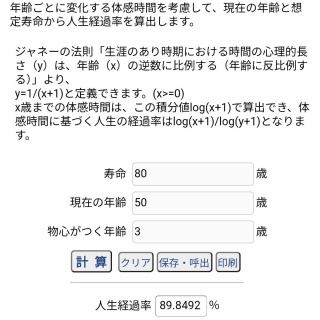1 : 「ジャネの法則」 主観的に記憶される年月の長さは年少者にはより長く、年長者にはより短く評価されるという現象 人生経過率89.8492% 3 : わかる 根拠は無いがなんかそろそろ死にそうな気がするんだ 7 : 50にもなれば人生でやらないといけないことはほぼ終わってるし、その先できることも限られてるしな