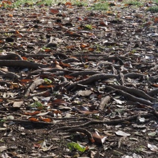 野に在りて詠まむ命のほのほ在りて詠まむとす走り根、である。古色蒼然、と云う言葉がある。走り根こそ、その象徴的な現象である。大概は巨木の根元を走っている、根っこの表出したものである。今まで随分走り根をみたけれど、やはり太くうねっていたのは春日大社の裏手の原生林の走り根である。その走り根は、いずれ紹介することにしたい。今日の走り根は、近所のケヤキの走り根である。それでも、立派な根っこである。季節は晩秋から冬への、過渡期。走り根に降り積む落葉、朽葉がもの悲しさを演出する。だがしかし、その必衰の理(ことわり)こそが諸行無常なのかもしれぬ。と、思う。盛者必衰の断りを表す。平家物語の一節で、ある。祇園精舎の花の色、がそれである。走り根に色が無いと云う、むきもある。けれど、それは違う。走り根に人生を反映する、そうした見方が正しい。あの隆々とした生き様こそが、走り根の心情の表出である。 走り根や落葉朽葉の隠すもの 荒 野人