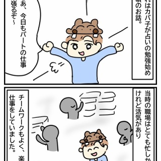 これはカバ子が占いの勉強を始めた頃のお話です。当時子育て真っ最中だったカバ子は、とある職場にパートに出ていました。※身バレ防止の為仕事内容はあやふやに描いています。忙しいかったけれどチームワークもよく、楽しく働いていたカバ子。子育てとの両立は大変だったけれど、凄くやり甲斐を感じていました。目一杯働いた後のビールの美味しかったこと。。さあ、今日も仕事頑張るぞーと思ったその時。窓の外に怖い顔の女が立っていたのでした。😱カバ子の占いが気になる方❣️ポチッとお願いします🤲 占いランキングオリジナルイラストランキングWeb漫画ランキング絵日記ランキングにほんブログ村