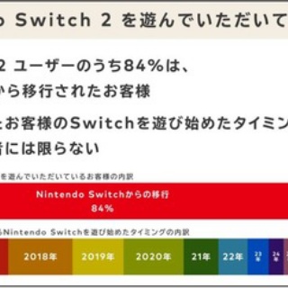 [任天堂HP]「2026年3月期 第2四半期決算説明会/ 経営方針説明会(オンライン)プレゼンテーション資料」を掲載しました。https://t.co/sxmQzzi0VW— 任天堂株式会社(企業広報・IR) (@NintendoCoLtd) November 5, 2025 「任天堂」の「2026年3月期 第2四半期決算説明会/ 経営方針説明会(オンライン)プレゼンテーション資料」などが公開されていますわ。・・・ゲーム機「Nintendo Switch 2」で遊ぶユーザーの内、「84%」の方が「Nintendo Switch」から移行していたそうですわ。元々、「Nintendo Switch」で遊び始めた時期はバラバラですが、遊んでいる期間が長い方の方が「Nintendo Switch 2」へ移行している割合が多いですね。「2025/6/5」に発売されてから「2025/9/30」までの約4ヵ月間の全世界累計販売数は「1036万台」という事で任天堂史上、(発売日から4カ月間で)最も売れたゲーム機になったそうです。未だに家電量販店などは売り切れが続いていますが、買いたい時に購入できる状態になるのは何時なのでしょうか。