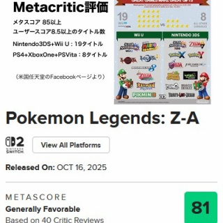 [レビュカン]任天堂ソフト「ポケモンレジェンズZ-A」のレビューが解禁、NBPをもってしても40レビュー平均のメタスコアは81点に