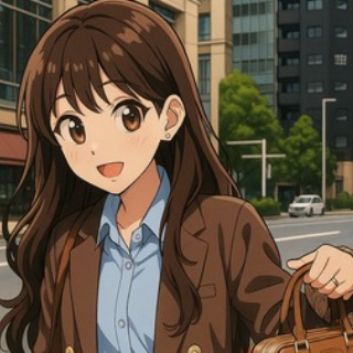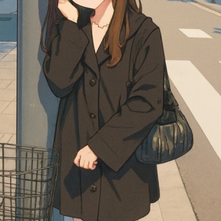 都会の街角で、ブラウンのジャケットを着た女の子が笑顔で立つアニメ風イラスト。やわらかな光と繊細な線画が、日常の中の温かい瞬間を表現しています。 An anime-style illustration of a smiling girl in a brown jacket standing on a city street. The soft lighting and detailed linework capture a warm and peaceful moment in everyday urban