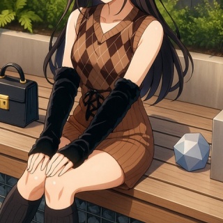 穏やかな午後、ベンチに座る女性を描いたアニメスタイルのイラスト。柔らかな光に包まれ、瞳に優しい輝きを宿した表情が印象的。ブラウンのアーガイル柄ワンピースと黒のアクセサリーが落ち着いた雰囲気を演出し、背景の緑が季節のぬくもりを感じさせます。自然の中で静かに過ごす一瞬の癒しを表現しました。 An anime-style illustration of a young woman sitting on a bench in gentle sunlight. Her warm expression and brown argyle dress create a calm mood, while lush greenery adds a peaceful touch. A quiet moment of relaxation captured in delicate, expressive detail.