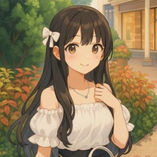 緑に囲まれたショッピングエリアのベンチに座る、可愛いアニメ風の女の子のイラストです。白いリボンとピンクの花を髪に飾り、ふんわりしたトップスとネイビーのスカートで春らしい装い。膝の上にはぬいぐるみチャーム付きのバッグがあり、優しい笑顔が印象的です。 A cute anime-style illustration of a girl sitting on a bench in a shopping area surrounded by greenery. She wears a white ribbon and pink flower in her hair, a soft off-shoulder blouse, and a navy skirt—perfect for spring. A plush toy charm hangs from her handbag, and her gentle smile adds warmth to the scene.