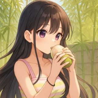 竹林に囲まれた静かな屋外で、パステルカラーのワンピースを着た女の子がドリンクを楽しむアニメ風イラストです。柔らかな光と自然の緑が、癒しの雰囲気を演出しています。紫の瞳とふんわりした髪が印象的な、穏やかなひとときを描いた作品です。 An anime-style illustration of a girl enjoying a drink in a peaceful bamboo garden. She wears a pastel-colored dress and has soft, flowing hair with expressive purple eyes. The gentle sunlight and lush greenery create a relaxing atmosphere, capturing a quiet moment in nature.
