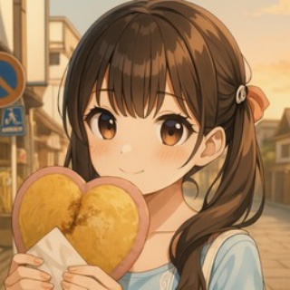 日本語 夕暮れの日本の街並みで、ハート型のお菓子を手に微笑む女の子を描いたアニメ風イラストです。レース付きの水色ワンピースとツインテールが可愛らしく、伝統的な建物やのぼりが背景に広がる、温かくノスタルジックな雰囲気の作品です。 English An anime-style illustration of a girl smiling while holding a heart-shaped snack on a traditional Japanese street at sunset. Her lace-trimmed blue dress and twin-tails add charm, while the background features nostalgic architecture and banners, creating a warm and peaceful atmosphere.