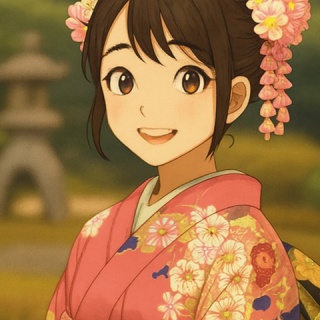華やかな振袖姿で日本庭園に佇む女の子。大きな瞳と優しい笑顔が、和の美しさと季節の彩りを感じさせるアニメ風イラストです。花柄の着物と髪飾りが、伝統的な雰囲気の中に可愛らしさを添えています。A charming anime-style girl in a vibrant floral kimono smiles gently in a traditional Japanese garden. Her big eyes and elegant pose capture the beauty of Japanese culture and seasonal grace.