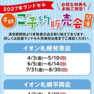 昨日(4/21)は久々4/2以来ですが、娘の家へ行き孫(長女:姫)のラン活をしました。 やはり実物を見て(背負ってみて)決めたいとのことで、2027年ランドセル早期予約販売会開催のイオンに行くことになりました。 イオン発寒や桑園では遠いので、販売会(多数展示)開催で娘の家から一番近い札幌苗穂店に行きました。 当初の姫の選んだものとは変わりましたが、同じブランド・色のものになりました。 来年度小学校入学の姫用なので、当然(姫が大好きで可愛くてたまらない...)ジジイからのプレゼントになりました....ヾ(ーoー;) CARD払いなので、再来月の口座引落しだと助かりますが....ヾ(ーoー;) →今月は固定資産税・都市計画税、来月は自動車税の支払いがあるので... <PS.> 孫(次女)のラン活は娘の旦那に任せたい....ヾ(ーoー;)