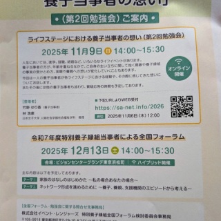令和7年度社会的養護経験者等ネットワーク形成事業の一環で「ライフステージにおける養子当事者の想い」(第二回勉強会)が11月9日㈰14:00~15:30にオンラインで開催されます。12月13日(土)の全国フォーラムも会場とオンラインのハイブリッド開催が予定されています。ご紹介しておきます♬
