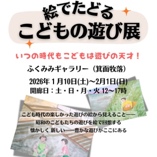 こども時代、どんなことをして過ごしましたか?遊んで遊んで、遊び疲れてご飯を食べて眠って、次の日にはすっかりまた元気!遊びは心の栄養、遊びから多くを学んで成長するこどもたち。そんな遊びも時代とともに、変わってきています。今回開催する『絵でたどるこどもの遊び展』は昭和時代のこどもたちの遊びを、絵で回想する展示会です。1920年代~1980年代にこども時代を過ごした一般の人々が描いた、自分たちの遊びのえには、自然豊かに、こども同士が、人と人とが直接つながって、遊んでいる姿がたくさんあります。懐かしく、でもこれからの新しい遊びの姿ではないかと思うのです。ぜひ、ご覧ください。1/24(土)にはワークショップも開催予定です。ご参加お待ちしております。「絵でたどるこどもの遊び展」 2026年1月10(土)~2月1日㈰ 開廊日 月・火・水・木12時~17時 主催 NPO法人ライフスキル研究所問合せ lifeskill.npo@gmail.comワークショップ「遊びを語ろう絵に残そう」1/24(土)10:30~12:00参加者募集中場所 ふくみみギャラリー〒562-0004箕面市牧落2-12-16Tel:072-722-7859最寄り駅阪急箕面線牧落駅下車徒歩5分
