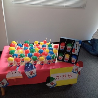 9月24日。 成り行きで子どもが以前通っていた保育園のお祭りを手伝う事に。 子どもは甚平を着て参加。 本格的なお祭りではなく、園児向けのお祭りごっこといった感じだった。 食べ物も作り物で、あくまでごっこ遊び。 このかき氷作りも毛糸などで作ったもの。 我々もこのかき氷作りを手伝った。 まだ第一回らしく、先生方も手探りな様子だった。 地域の方が来てもらう枠も設けたとの事だったが、一組しか応募はなかったらしい。