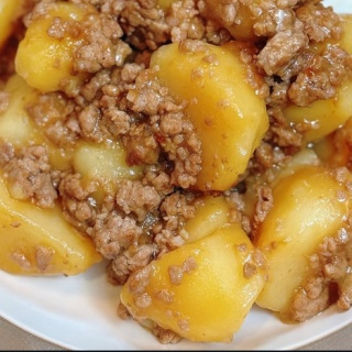 こんにちは!今日は最近食べムラが始まったむちゅめのいっちゃんがパクパク食べてた、ひき肉とじゃがいものやつを、紹介しようと思います。 [材料]じゃがいもひき肉酒みりん醤油片栗粉水 【作り方】1.じゃがいもの皮を剥いて一口サイズに切って水にさらしておく。2.フライパンに油を引いて挽肉をいためる。火が通ったらジャガイモIN。3.水をジャガイモの3分の1がつかるぐらい入れて、醤油、酒、みりんを好みの味になるまで入れる。4.煮立ったら、アクをとりながらじゃがいもが柔らかくなるまで煮る。5.水炊き片栗粉を作り、4に回し入れる。とろみがついたら完成🫡[私は4の作業が待てないのでレンチンで時短します。]むちゅめとパパから大絶賛👏良ければみなさん作ってみてください。