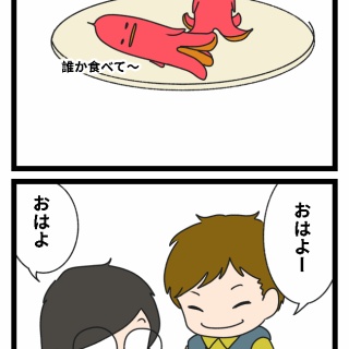 よったんの運動会用のお弁当にタコさんウインナーを作ったけど2個余った軽い気持ちで朝ごはんに追加で置いといたら…タコさんウインナーって呼んでるけどこれタコじゃないねww宇宙人?けど我が家ではみんなこれをタコさんウインナーって言ってる(笑)