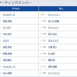 転載元: https://tanuki.5ch.io/test/read.cgi/livebase/1776395400/https://sp.baseball.findfriends.jp/?pid=game_flash_info&game_id=2026041701 544: どうですか解説の名無しさん 2026/04/17(金) 17:16:18.46 ID:j1FZQO7Bd 4/18(土)の予告先発 (S-G)奥川恭伸×マタ (T-D)大竹耕太郎×大野雄大 (C-DB)ターノック×東克樹 (F-L)伊藤大海×武内夏暉 (E-M)ウレーニャ×田中晴也 (H-B)上沢直之×九里亜蓮 547: どうですか解説の名無しさん 2026/04/17(金) 17:18:08.88 ID:j1FZQO7Bd 1 (遊) 長岡 秀樹 1 (中) 佐々木 俊輔 2 (左) サンタナ 2 (左) キャベッジ 3 (捕) 中村 悠平 3 (遊) 泉口 友汰 4 (一) オスナ 4 (三) ダルベック 5 (中) 岩田 幸宏 5 (捕) 大城 卓三 6 (二) 伊藤 琉偉 6 (右) 丸 佳浩 7 (三) 武岡 龍世 7 (一) 増田 陸 8 (投) ウォルターズ 8 (二) 浦田 俊輔 9 (右) 丸山 和郁 9 (投) ウィットリー