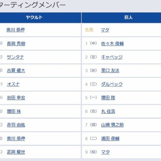 転載元: https://tanuki.5ch.io/test/read.cgi/livebase/1776490845/https://sp.baseball.findfriends.jp/?pid=game_flash_info&game_id=2026041801 510: どうですか解説の名無しさん 2026/04/18(土) 17:18:24.52 ID:GT+jM+0+d 1 (遊) 長岡 秀樹 1 (中) 佐々木 俊輔 2 (左) サンタナ 2 (左) キャベッジ 3 (捕) 古賀 優大 3 (遊) 泉口 友汰 4 (一) オスナ 4 (三) ダルベック 5 (中) 岩田 幸宏 5 (一) 増田 陸 6 (右) 増田 珠 6 (右) 丸 佳浩 7 (三) 赤羽 由紘 7 (捕) 山瀬 慎之助 8 (投) 奥川 恭伸 8 (二) 浦田 俊輔 9 (二) 武岡 龍世 9 (投) マタ 511: どうですか解説の名無しさん 2026/04/18(土) 17:18:42.36 ID:GT+jM+0+d 日替わり5番は陸か