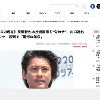 1. 匿名@ガールズちゃんねる http://jisin.jp/entertainment/entertainment-news/2549309/ ・山口達也 現在、山口は企業や自治体向けの講演活動を行っている。 「山口さんはアルコール依存症の当事者であるうえ、タレント経験から話が上手。オファーが絶えないといいます。年間およそ100本もの講演をこなしており、講演料を含めると年収は7千万円にも上るそうです」(前出・芸能関係者) ・長瀬智也 ’25年11月、長瀬はインタビューでこう語っている。 《ひょっとしたら今後、役者としての仕事もあるかもしれません》(「週プレNEWS」11月29日配信) 「具体的に演技の仕事が決まっているわけではなく、あくまで“可能性としてはありえる”ということのようです。それに、長瀬さんとしては監督などの裏方を志向しているといいます」(前出・芸能関係者) 2025/12/24(水) 14:33:53