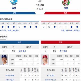 https://www.chunichi.co.jp/article/1116525https://nishispo.nishinippon.co.jp/article/814537■今日の見どころ豊橋で開催されるこの一戦。中日の注目は田中。同球場では過去2試合の出場でいずれもタイムリーが飛び出すなど、計7打数5安打をマークしている。このところは打撃不振に苦しんでいるだけに、好相性の地で復調のきっかけをつかみたい。対する広島の注目は坂倉。4月11日のDeNA戦で今季初アーチを描くと、一昨日の試合でもタイムリーを放つ活躍を見せた。今日も持ち前の打棒を発揮し、チームを連敗ストップに導けるか。https://baseball.yahoo.co.jp/npb/game/2021038711/top