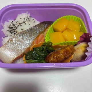 塩鮭マンゴーの寒天ほうれん草のソテーマルハニチロの牛カルビマヨニチレイのスイートポテトご飯にほんブログ村