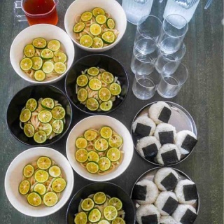 トンネル工事の方のお昼ご飯です。すだちうどんとおにぎり。肉味噌山椒がはいってます。うどんのスープは冷で。うどんだしレシピです。水 3600c塩 30g砂糖 35gみりん 100cc薄口醤油 100cc濃口醤油 50cc前日、水に昆布つけておきます。上の材料、合わせて温めて、鰹節を。沸騰したら火を止めます。温でも冷でもオッケー! 麺類は人気だね!