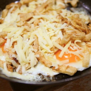 目玉焼き焼いて、油揚げ刻んんで空焼きしてしょうゆかけて、焼いた目玉焼きの上にかけて、さらにチーズもたっぷりのせて。こんな一品が好きなんだなぁ。黄身を割らないように食べる、料理魔法の言葉を伝えておくよ。キミワレンほら、上手に食べられたね。よかったよ。滝村雅晴