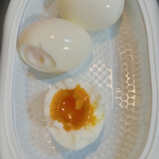 水量1/3くらいから沸騰後、4分で水を足す(コップ1 卵が浸るくらい)7分40秒 取り出し冷却と日々割り殻剥き一つ仕損じたが悪くない黄身は半熟真ん中は穴空けが足りなかった