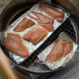 今回は素人なりにスモークサーモンを作ってみた記事になります思った以上に美味しくできたので、紹介していきます!それではまずは材料から【材料】・サーモン200g(生食用が良いです)ソミュール液(燻製を漬ける液)・塩 20g・砂糖 5g・胡椒 少々・ハーブ(お好きなものを)今回は使っていませんそれでは次は手順を書いていこうと思いますサーモンを開けて、ソミュール液に漬けますソミュール液は本当はお酒等を使って煮込むそうなのですが、今回はただ水に溶かしただけです水の量はサーモンが浸かるくらいの量です!この状態で冷蔵庫へ30分ほど静置しますその後取り出して、30秒ほど水に漬けて表面を洗い流し、塩抜きをします今回は薄切りなので、塩抜きの時間を短めにしていますこの後、ラップでくるんで、再び冷蔵庫へ2時間ほど静置しますその間に燻製の準備をしていきますキャンプ用の調理BOXから「固形燃料、ライター、燻製チップ等」を取り出します燻製器(ホームセンターで安くなっていたものを買ってきたので有名なメーカー品ではなさそうです)燻製チップはキャプテンスダックのミックス炭を用意するために、燻製機の網で焼いていきます固形燃料は100均のもの、唯一の問題点は炭が古いのでしっかり着火してくれるか・・・炭を下ろしてチップを置いてみたところ問題なさそうなので、このままいきます直に網に置くと張り付いてしまい、身が崩れてしますのでアルミホイルにのせて燻していきます本当は良くないんですが、撮影の為、煙の状態を確認しましたが良い感じです!温度は60℃~80℃を維持するようにします30分ほど放置していたら、温度が下がってきていたので一度開けて確認しました想像以上に油が出てきましたね結局温度維持が難しかったので、カセットコンロを出して温度を見ながら、つけては消してを繰り返しますチップも途中で継ぎ足しています合計で1時間ほど燻して、良い色になったので終了とします余っていたチップでベーコンとチーズを軽く燻し、スモークサーモンと一緒に野菜炒めに投入一応低温調理の安全基準として、60℃以上で1時間は守っているのですが、生食用のサーモンでは無く少し怖かったので、追加で炒めています香り、塩味も丁度良く、思った以上に良くできました香りは今回ミックスの物を使用した為「サクラ、ブナ、ナラ、カエデ」のチップあまり癖が無く、なんにでも使えるので便利なのですが、癖が無いので個性が出なくて食べて瞬間の驚きも少ないんですよね~ホームセンターのキャンプコーナーの縮小で安売りされていた、リンゴとクルミのスモークウッドを手に入れられたので、今度は冷燻にでも挑戦してみます最後に作り方をおさらいしていきましょう!1.液を準備する(塩、砂糖、胡椒、ハーブ)2.サーモンを液に漬け、30~60分冷蔵庫へ3.サーモンを真水に漬ける(30~60秒ほど)4.ラップでくるんで冷蔵庫で寝かせる(2~3時間)5.1時間以上温燻(60~80℃)完成!という流れです!というわけで今回はここまでではでは~ここからは今回の記事で紹介した商品等を紹介していきます↓購入した燻製器は少し使いにくいので、SOTOの組み立て式のスモーカー↓ ↓燻製用の温度計SOTOのものが比較的短くて使いやすいです↓ ↓燻製用のチップです「サクラ」は万能で使いやすいです↓ ↓SOTOのミックスタイプのチップはこちら↓ 燻製の初心者向けの本です ↓楽天ではこのようなものも↓ホンマ製作所 ステンレススモーカー F-240S【日本製】【温度計付】【燻製チップ付】【燻製器】【簡単】【くんせい】価格:7,800円(税込、送料無料) (2026/1/23時点) 楽天で購入 上記で紹介しているのは一例なので、使いやすそうなものを選んで買うのがおススメです個人的にスモーカーは縦に長くて大き目のものをおススメします今の燻製器の背が低くて使いにくいので・・・ブログ“ゆるチャリダーの日誌”は毎週土曜日の08:00の更新を目指して頑張っています!上記のAmazonリンクから商品を購入頂けると購入代金の一部が収益となり、ブログ記事やYouTubeで紹介する商品の購入資金、大分県豊後大野市のトレイル整備(里山・林道・登山道の整備)活動の資金にさせて頂いております!↓↓↓↓【オススメの記事はこちら】↓↓↓↓