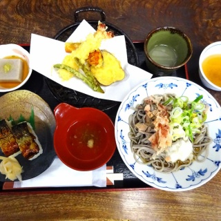 2021年12月4日(土)羽二重餅の古里(14:10~14:30)HP → 羽二重餅の古里【マエダセイカ】北陸・福井名物のお菓子処(施設案内)福井は羽二重餅が有名ですね。お土産を渡して場所を特定してくれる品はありがたいです。こちらでも恐竜をアピールしていました。入り口は恐竜一色です。「大本山永平寺御用達」の板看板が誇らしげです。試食もでき、楽しく買い物ができますが、種類が多いため、どれにしようかと迷ってしまいました。越前そばの里(14:53~15:58)HP→ トップページ - 越前そばの里福井北ICから武生ICに移動、インター近くにあるお店に到着です。遅い昼食を是非越前そばでと、急いでそば処へ!あとで気づいたのですが、ラストオーダーが15時までと書いてありました。なんとかセーフです。「ふくいセット」か「たけふセット」か悩みましたが、後者となりましたおろしそば、焼き鯖寿司、天ぷら、そば豆腐のセットです。旅の最後に福井名物に出会え大満足でした。デザートは「そばソフトクリーム」にしました。もっと立ち寄ってみたい名所も沢山ありましたが、今回も充実した2日間、大満足の旅となりました。今回の旅 福井県の観光名所とあわら温泉 はおしまいです暫定記事・・・今後掲載予定旅リスト に続きます前の記事 福井県立恐竜博物館 その3