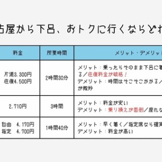 名古屋から下呂に行く、直行バスを見つけました!おトクなの?どうなの?調べてみました。名古屋ー下呂の直行バスは南飛騨観光が出しているバスで、1日1便が出ています。名古屋から下呂は、14:00出発で16:30到着、下呂から名古屋は、10:30出発で、13:00到着。(途中休憩1回あり)料金は、片道3,300円。往復だと4,500円という破格なお値段!名古屋方面から下呂、通常考える公共交通機関はJRです。JRで、名古屋から東海道線で岐阜、岐阜から高山線で下呂、というルート。普通乗車料金は、2,310円。所要時間は時間帯にもよりますが、このバスと同じくらいの時間帯の午後2時台だったら乗り換えもあって3時間くらいかかります。コスパ的には最安ですが、ちょっと時間がかかりすぎですよね。乗り換えなどは慣れないと難しいし疲れます。同じルートで特急を使うと時間的には早くいけます。「特急ひだ」なら、名古屋から下呂まで乗り換え無しですし。特急自由席代を合わせると、4,170円特急指定席だと、4,700円。所要時間は1時間30〜40分です。JRで普通科、特急かの選択肢しかないかと思っていたんですが、今回ネットで調べてたら、直行バスを見つけちゃったんです。直行バスの片道3,300円は、JRで全路線普通で行く2,310円より高いけれど、時間的にはちょっと短縮されるし、乗り換えがないのはありがたい。名古屋でバスに乗ってしまえば後は座っているだけで下呂に着いちゃうというのは楽ちんです。往復ともバスを使うなら4,500円で、これは普通の往復より安くなります。特急ひだ指定席の片道4,700円よりも安いですもんね。ただこの直行バス、時間帯が微妙。夕方4時半に下呂に着いて、翌朝10時半に下呂を出る、となると、下呂の滞在時間が短すぎる。お湯を楽しむだけなら十分な時間ですが、観光もしたいとなるとちょっともったいないですね。もっと早い時間に下呂に着きたいし、もっと遅く下呂を出たい。交通機関と料金、時間、メリット・デメリット、まとめてみました。 ⇓⇓⇓直行バス、1泊だと下呂滞在時間が短くてもったいない感じですが、2泊するならどう?夕方4時半に下呂に着いて、その日はホテルに直行でのんびり。翌日は1日中、観光したりホテルに戻ってお風呂を楽しんだり、何なら他のホテルの日帰り入浴や、町中に点在する足湯も楽しめます。そしてもう1泊して翌朝、朝風呂を楽しんでからバスで名古屋に向かう。これがいいのかも。実際1泊だと、翌日朝風呂でまったりした後に観光に出かけて、結局疲れて帰ることになります。2泊して、お湯の良さを体に染み込ませたまま帰る、これが「温泉に泊まったー!」って満足感を残したまま旅を終える最適解なのかも。特に高齢者と一緒の時は、いいお湯に入ってそのまま帰るのが良さそうです。詳細はリンクをかけておきますね。