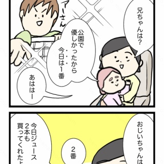 今日も引き続き「大分からじいちゃんばあちゃんやって来た」シリーズの続きを載せたいと思います。ちょこは東海住みなのですがちょこの実家もマーさんの実家も大分です。子どもたちがじいちゃんばあちゃんに会えるのも年2、3回。今回はちょこの両親が東海に遊びに来たお話です。大分からじいちゃんばあちゃんやって来た①はこちら↓ 普段は兄弟喧嘩をたくさんするハルさんとアーさん。前回の公園のお話でハルさんが優しかったから「今日は1番好き!」と。明日は変わるかもしれない笑それはまあ普段を見てるからわかるけどじいちゃんは・・・可哀想じゃないか😅?咄嗟に出たいいとこがジュース2本買ってくれたこと私も・・・他に何かあっただろうと今思う笑前のお話はこちら↓次のお話はこちら↓ 他にもあるよ♪シリーズ物↓