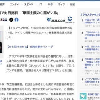 1 : https://news.yahoo.co.jp/articles/d33f418655ddfada460ce987e880d6b7cdc94e02 中国の王毅共産党政治局員兼外相は14日、ドイツで開催中のミュンヘン安全保障会議で演説した。 アジア太平洋の緊張を巡る司会者の質問に対し、「日本には台湾への侵略・植民地支配の野心がいまだ残り、軍国主義の亡霊が徘徊(はいかい)している」と語り、プロパガンダを展開。「良識ある人々は警戒すべきだ」と対日批判を繰り広げた。 王氏は、台湾有事が日本の「存立危機事態」に該当し得るとした高市早苗首相の発言について「中国の領土主権を直接的に侵害するものだ。絶対に受け入れられない」と強調した。ドイツが「ナチスの犯罪」を徹底的に反省したのとは対照的に「日本は戦犯を英霊として祭っている」と主張。「(日本が)かつての道を歩めば、より壊滅的なことになる」と威嚇した。