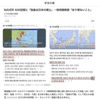 1 : NAVER AIの回答に「独島は日本の領土」…徐坰徳教授「あり得ないこと」 韓国最大のポータルサイトNAVER(ネイバー)の検索結果の最上部に表示される人工知能(AI)の回答が、独島(ドクト、日本名・竹島)を日本の領土と表記しており、「独島の門番」として知られる誠信(ソンシン)女子大学の徐坰徳(ソ・ギョンドク)教授が是正を求めた。 30日、徐教授は自身のSNS(ソーシャル・ネットワーキング・サービス)に「ネットユーザーからの通報で知った」とし、「NAVERの検索窓に『日本領土』と入力すると、『日本の領土は独島(竹島)、北方領土、尖閣諸島などで構成されています』と説明している」と伝えた。 https://s.japanese.joins.com/jarticle/340423