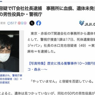 東京都港区のIT企業で発生した役員男性の行方不明事件は、社長の逮捕という重大局面を迎えました。遺体が見つかっていない中での立件という異例の展開に、ネット上でも大きな注目が集まっています。 本記事では、報道内容を整理しながら、事件の背景やポイントをわかりやすく解説します。 要点まとめ IT企業社長が死体遺棄容疑で逮捕 役員男性は行方不明のまま、遺体は未発見 血痕やレンタカー利用など状況証拠が浮上 目次 ニュースリンク集 深掘りニュース記事 事件の概要 ネットの反応 まとめ 出典 ニュースリンク集 Yahoo!ニュース(本件報道) 深掘りニュース記事 今回の事件で注目されているのは、遺体が見つかっていない段階での逮捕という点です。 通常、死体遺棄罪は遺体の存在が前提となるケースが多いですが、本件では以下のような状況証拠の積み重ねが重視されたとみられます。 事務所内で複数の血痕が確認された 行方不明の役員が長期間連絡不能 社長によるレンタカー利用履歴 これらの要素から、捜査当局は「遺体が存在していた可能性が高い」と判断し、立件に踏み切ったと考えられます。 また、容疑者が否認していることから、今後は物証の精査や供述の裏付けが焦点となります。 事件の概要 東京都港区のIT企業で、50代の男性役員が行方不明となり、その後、会社代表が死体遺棄容疑で逮捕されました。 発生時期:2025年秋ごろとみられる 状況:事務所内で血痕を確認 被害者:会社役員(現在も行方不明) 容疑者:会社社長(容疑を否認) 遺体が見つかっていないことが、この事件の最大の特徴となっています。 ネットの反応 ネット上では、事件の異例性に対してさまざまな声が上がっています。 「遺体なしで逮捕は珍しい」という驚き 「血痕があるなら相当な証拠では」という見方 「冤罪の可能性も考えるべき」という慎重論 「社内トラブルの背景が気になる」という指摘 特に、証拠の重みや捜査の進め方に関する議論が目立っています。 まとめ 本件は、遺体未発見という異例の状況 現時点では状況証拠が中心であり、今後の捜査によって事件の全容がどこまで明らかになるか 続報次第では、刑事事件としての判断にも大きな影響を与える可能性があり、引き続き注視が必要です。 出典 Yahoo!ニュース元記事