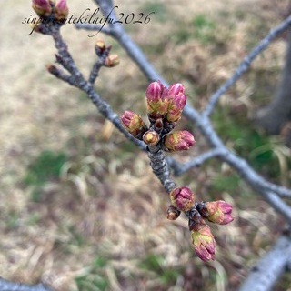 昨日は雨予報、スマホの天気は雨が降ってました。でもまだ降っていません。洗濯物を風呂乾燥にして昼前に歩き始めました。外は全体的にどんより。昨日のサクラは一昨日よりも蕾が紅い。もう数日で開くかな?見たし撮ったし、さあ歩こう。しばらくすると顔に水がかかりました。傘を持ってるので早々にさしました。風に飛ばされなようにしっかり傘を持って歩きました。もうすぐ折り返しする所の手前ので手を振る知人が!挨拶して立ち話。「このまま一緒に話しながら帰るわ」色々話して、話題は桜の開花時期になりました。「今年はお花見せえへん?お団子とか食べて、あっ!買いに行かんなんな」「朝から買って来たげる、午後からやろ?」「三色とみたらし、あんこもいいな」「3つとも買おう」笑笑って事で、桜が咲いたらお花見です。わ~い。