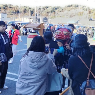 2026年1月2日、びはんオール店前で山田大神楽の演舞がありました。 こどもたちが頭を噛んでもらっていました。邪気を払い、この一年健康に過ごせますように。(千)