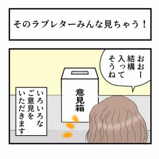 スポーツクラブには必ず「ご意見箱」があると思いますが、ここに意見を入れる場合はくれぐれも気を付けてくださいね。「〇〇さんへ」と書いてあったとしてもそんなことは関係なく、スタッフ全員で見たりするからです。店によるかもしれないけど私が働いていた店では休館日(ミーティングや掃除をするためスタッフはみんな出勤している)にみんなで読んでました、この漫画のように。普通のご意見や要望なら別に問題ないのですが、たまーに「〇〇さんは素敵です」「もっと〇〇さんのレッスンを受けたいので増やしてほしいです」なんて書かれていて、〇〇くんも「あの人すげぇな。まいったな」なんてこともありますから「他のスタッフに読まれたら嫌だなと思うこと」はどうかお書きにならないことをお勧めします💦今までの話はこちらからどうぞ♪