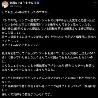 1: 名無しのがるび 2025/11/19(水) 10:41:12.56 ID:RwA4Y9bK9 「サンデー」連載中の漫画家、前編集者に怒!入稿遅れ、無断のセリフ変更など暴露「心の糸が切れて」投稿 「週刊少年サンデー」で「能」を題材にした「シテの花-能楽師・葉賀琥太朗の咲き方-」を連載している壱原ちぐさ氏が17日、自身のX(旧ツイッター)を更新し、前担当編集者のずさんな仕事ぶりを暴露した。 壱原氏は「とても悲しい事実を知ったのですが…」と切り出した。 「シテの花」が読者アンケートでは、掲載される約20作品の中で、平均7位だと説明。 続けて「どうして掲載順がいつも後半なんだろうと思っていた」と疑問があったと明かした。 「私が締切3日前くらいに提出している原稿を前担当編集さんは締切翌日とかに入稿していて、前半に掲載するにはリスクが高い締切を守れない作品だと編集部に思われていたらしく…え??そんなことある??と…」と思わぬ実情を公開した。 「こんなしょうもないことで掲載順を下げられたり1周年のカラーも巻頭ではなくセンターになってしまうんだなと…」と“実害”にも言及。「他にも色んな言えない悪いことが起きてしまっていて、本当に悲しい 悔しくて気持ちの整理がつかないです…」と本音をつづった。 「シテの花」は事故で顔にケガを負った元アイドルの少年が「能」の世界に魅了され、能楽師を目指す物語。なじみの薄い「能」の舞台裏などもまじえつつ、ドラマチックな展開で高い人気を維持している。 続けての投降では、掲載順やカラーの扱いはアンケートだけで決まるものではないとした上で「それにしたって今作はアンケ順位と掲載順の乖離がかなり激しい状況でした」と説明。 前担当者は校了日になっても最終確認のための連絡が来ないことや、セリフの一部を無断で変更されたりしたこともあったと暴露した。 新たな担当者に確認したところ「単に入稿作業を『忘れていた』という回答」だった。 あまりの怒りに「心の糸が切れて」ついXに投稿してしまったとあきれるように説明。 その上で、2人いる前担当者を「叩くようなことはしないであげてください 暴力になってしまいます」と注意を促した。 あえてSNSで実情を公開した理由は、作品のファンに「本当は人気だと伝えたかったこと」だとした。 また、作品のために多くの能楽関係者が協力していることにも言及。「そこには『この作品をきっかけに能に触れる人が増えたら』という想いも確実にある中で、作品の名誉を守らないといけないと思った」ともつづった。