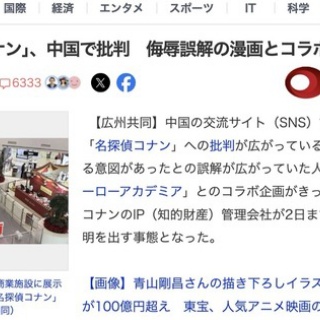 1 : https://news.yahoo.co.jp/articles/c2fa387444b9a8f04753e6e6195574541838d1bc 中国の交流サイト(SNS)で人気アニメ「名探偵コナン」への批判が広がっている。中国を侮辱する意図があったとの誤解が広がっていた人気漫画「僕のヒーローアカデミア」とのコラボ企画がきっかけ。中国でのコナンのIP(知的財産)管理会社が2日までに釈明する声明を出す事態となった。 僕のヒーローアカデミアを巡っては、登場人物の名前が日中戦争中に細菌兵器を開発した旧日本軍の関東軍防疫給水部(731部隊)を想起させるとして2020年に中国で批判が起きた。 コナンは今年で放送開始から30周年で、アニメ放送の開始から10周年となる僕のヒーローアカデミアとコラボ企画を展開。双方の原作者が互いの作品の主人公を書き下ろしたイラストを公開するなどしていた。全文はソースで
