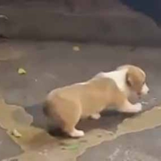 子犬がトコトコ歩いていた。ひんやり気持ちいいのかな? → こんな姿になるんです…