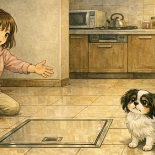 そろそろ寝る時間になり ぷぅはいつもママに抱っこされ 2階の寝室に移動する ママは床下収納の前で 「ぷぅ おいで」と 両手を広げてぷぅを呼んだ 床下収納の上を怖くて歩けないぷぅは ママが呼んでいるけど進めず 立ち往生 ごめんね ぷぅ ここは歩けないよね