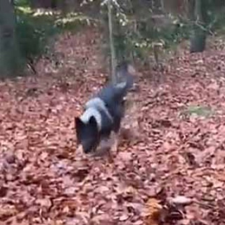 落ち葉が広がる森の中。 そこに1枚の落ち葉を隠してみる。 警察犬はこんな感じ…
