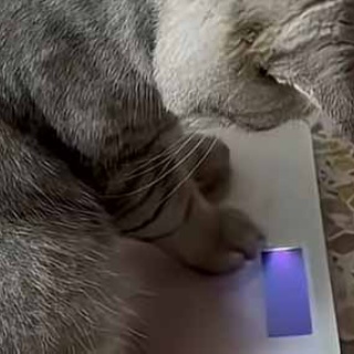 獲物狙って伏せる猫さん。 その頭上をオモチャが飛んでくる。 猫さんはこんな感じ…